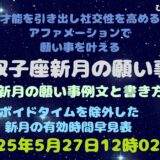 2025年5月27日12時02分に双子座で新月が起こります。新月の願い事をより効果的に叶えるためにアファメーション等を行なう場合には、この時間よりも前になってしまうとせっかくの新月の恩恵が得られなくなってしまいますので、この時間以降にしましょう。